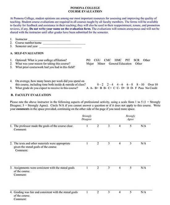 Background. Course evaluation is an electronic or paper questionnaire that requires responses to helps the instructor know about their course and instructions. Course evaluation forms & samples.